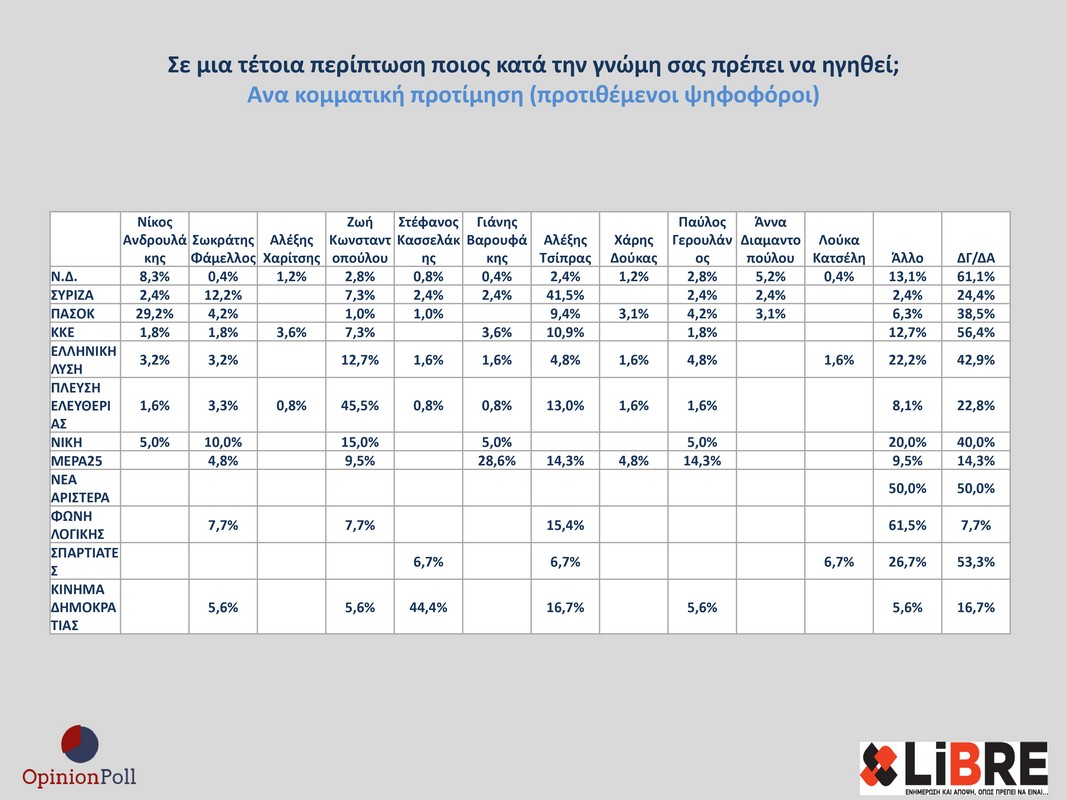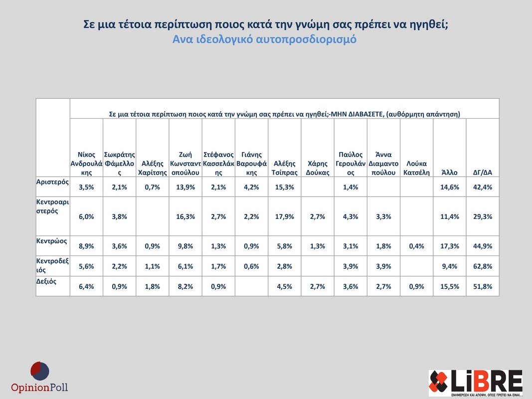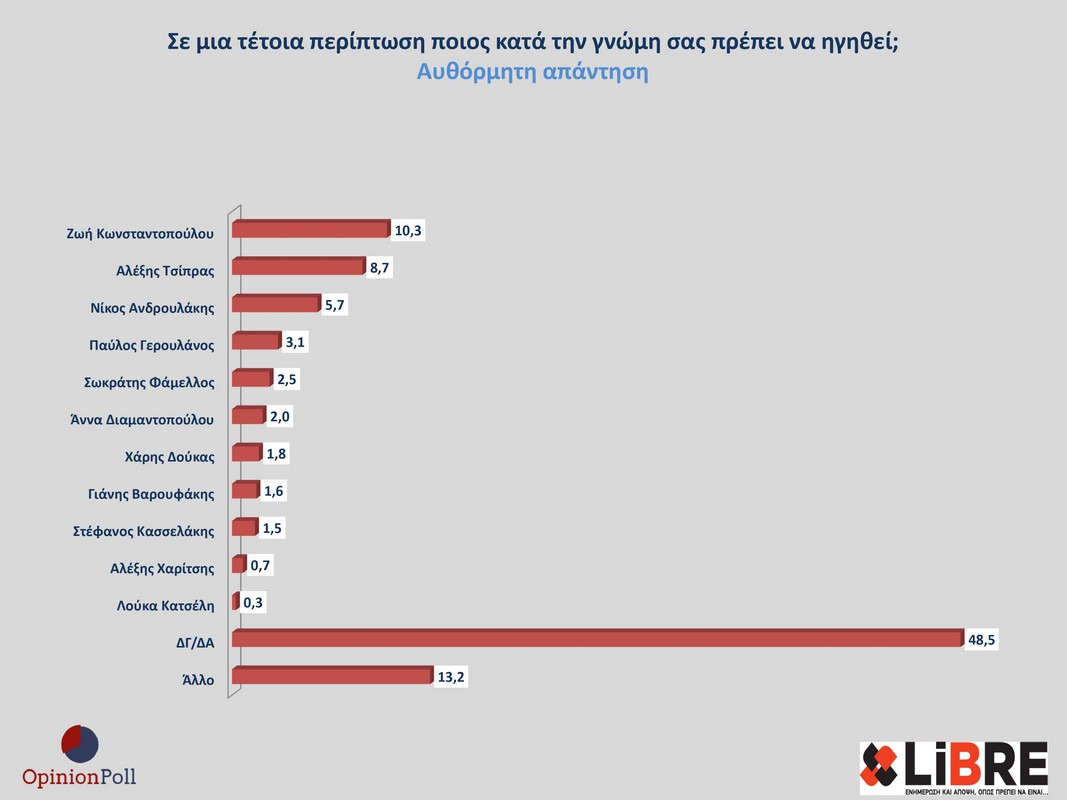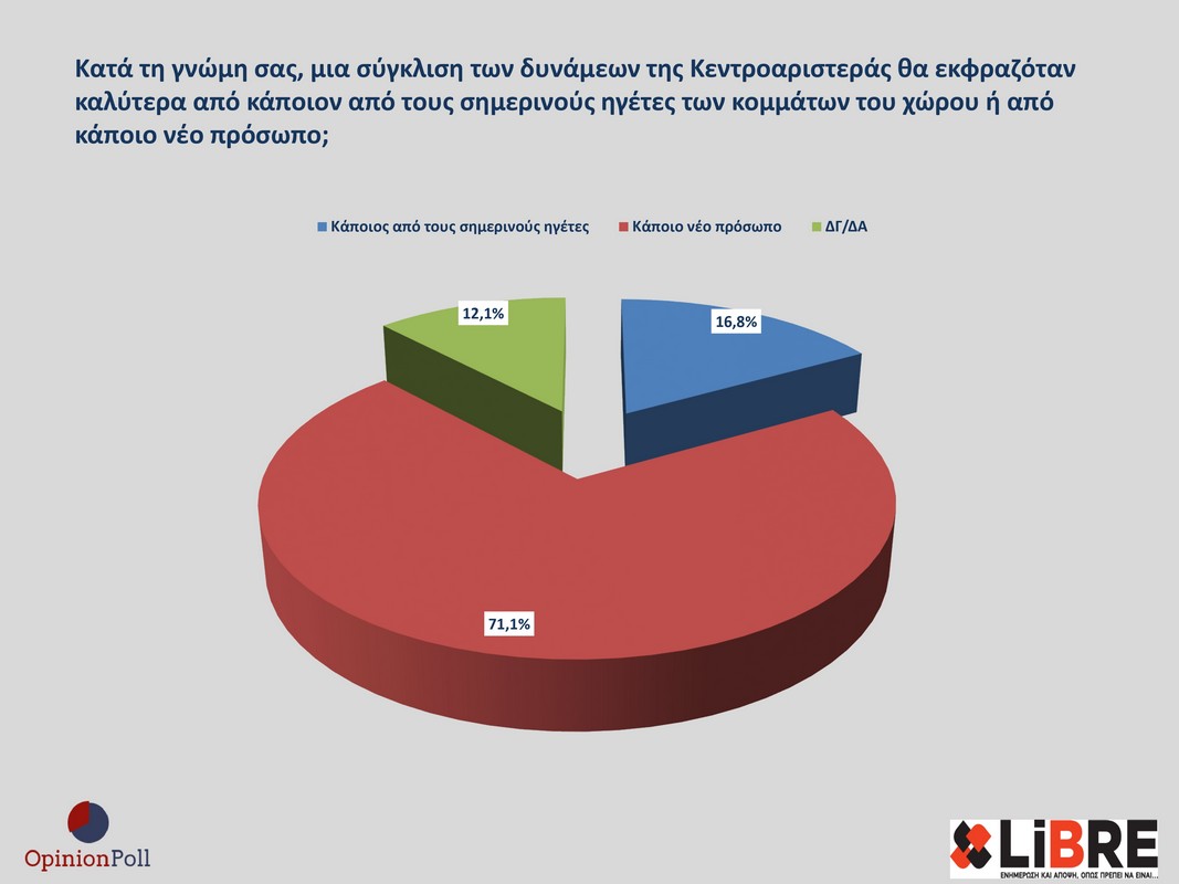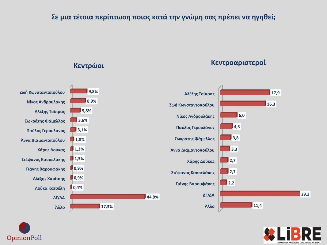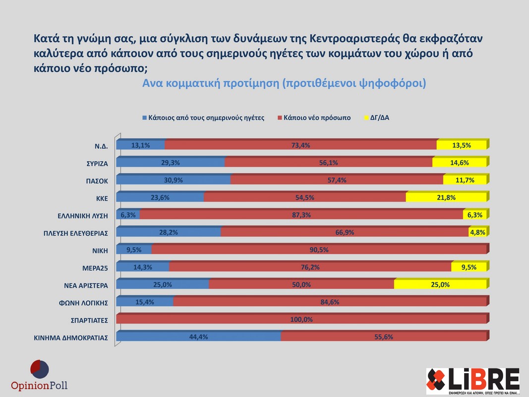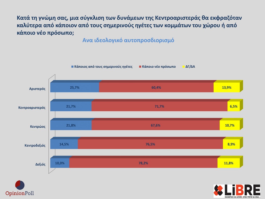 Το 71.1% θεωρεί ότι μια σύγκλιση των δυνάμεων της κεντροαριστεράς θα εκφραζόταν καλύτερα από ένα νέο ηγέτη έναντι στο 16.8% που θεωρεί ότι θα ήταν καλύτερα να είναι κάποιος από τους σημερινούς ηγέτες των κομμάτων του χώρου. Σε αυθόρμητη απάντηση ποιος πρέπει να ηγηθεί σε μια τέτοια περίπτωση, προηγούνται οι Ζωή Κωνσταντοπούλου με 10.3% , Α. Τσίπρας με 8.7% και ο Ν. Ανδρουλάκης με 5.7%.