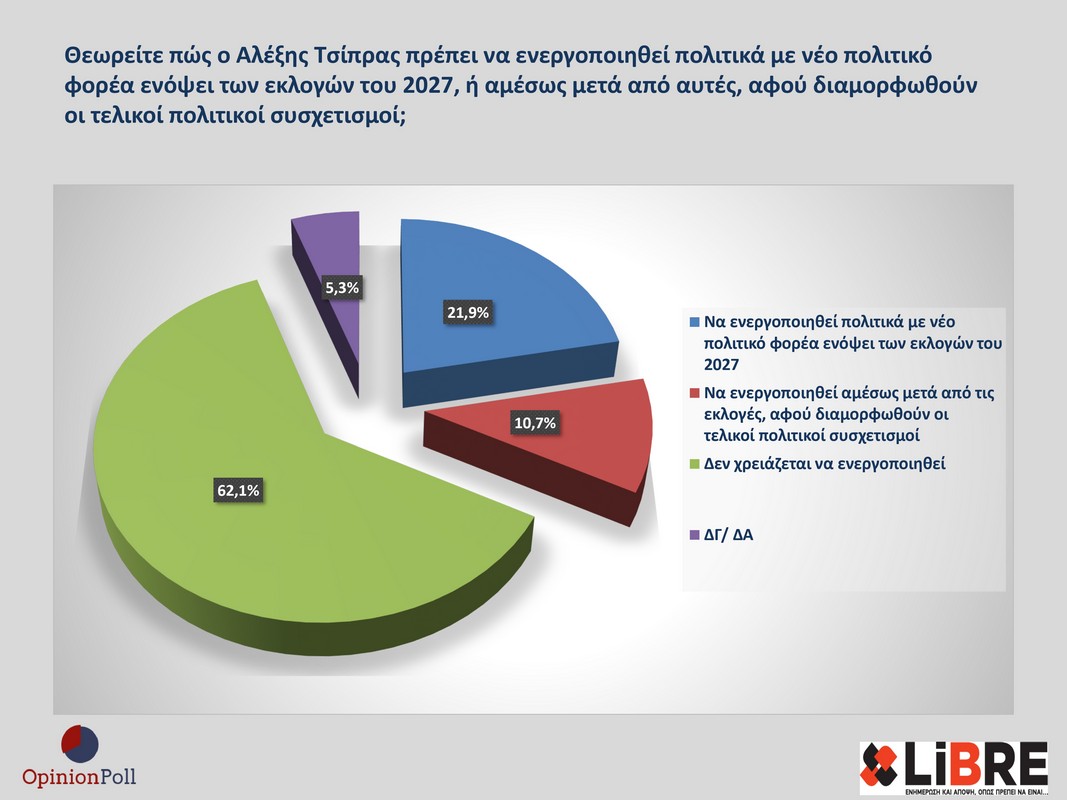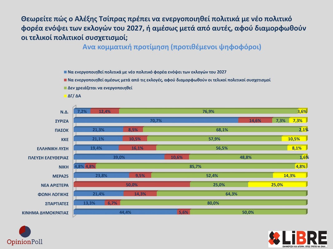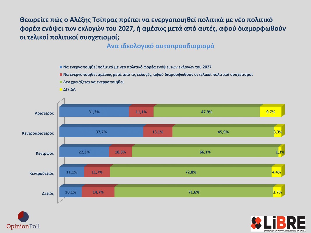 Το 21.9% τάσσεται υπέρ της άποψης να ενεργοποιηθεί ο Α. Τσίπρας με νέο πολιτικό φορέα ενόψει των εκλογών, το 10.9% υπέρ της άποψης να ενεργοποιηθεί μετά τις εκλογές και το 62.1% απαντά ότι δεν χρειάζεται να ενεργοποιηθεί. Ανάμεσα στους κεντροαριστερούς το 44.8% απαντά πρωτοβουλία τώρα, το 35.5% μετά τις βουλευτικές εκλογές και το 12% να μην ενεργοποιηθεί.