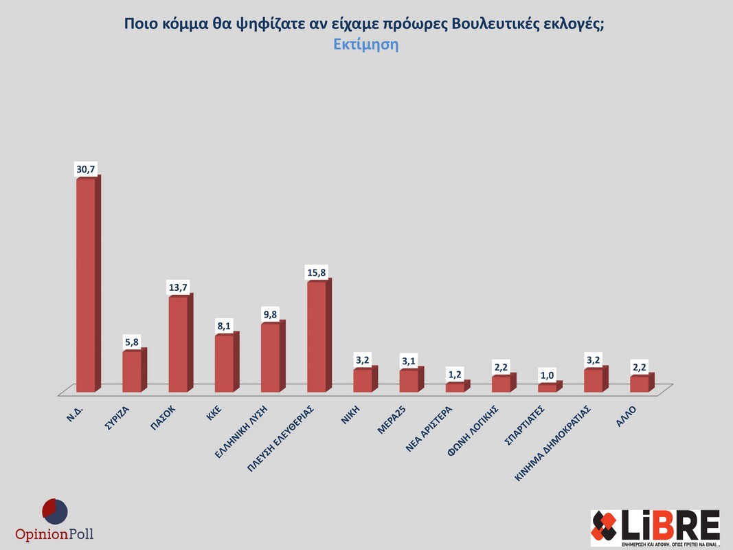 Στην περίοδο που διεξάγεται αυτή η συζήτηση φαίνεται να ανεβαίνει οριακά και άλλο η Ν.Δ με 30.7% στην εκτίμηση ψήφου και 14.9% διαφορά από την δεύτερη Πλεύση Ελευθερίας που συγκεντρώνει 15.8% και τρίτο το ΠΑΣΟΚ με 13.7%.