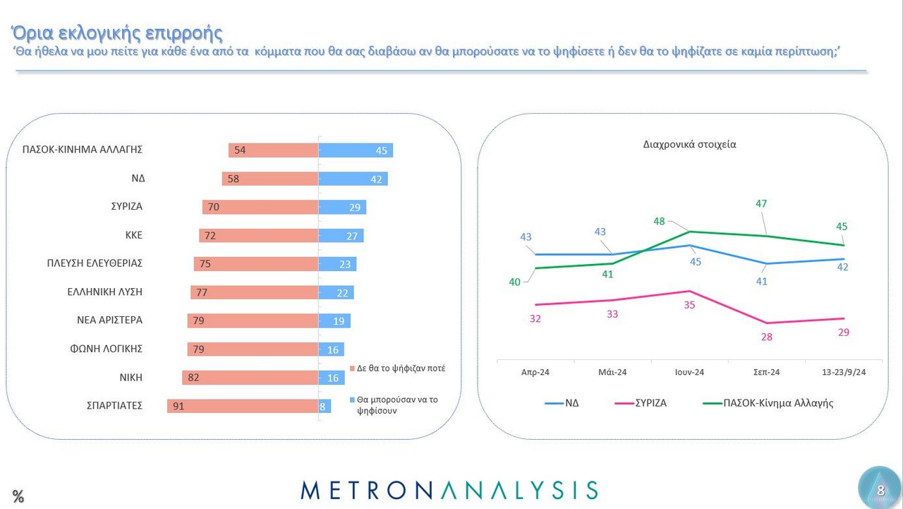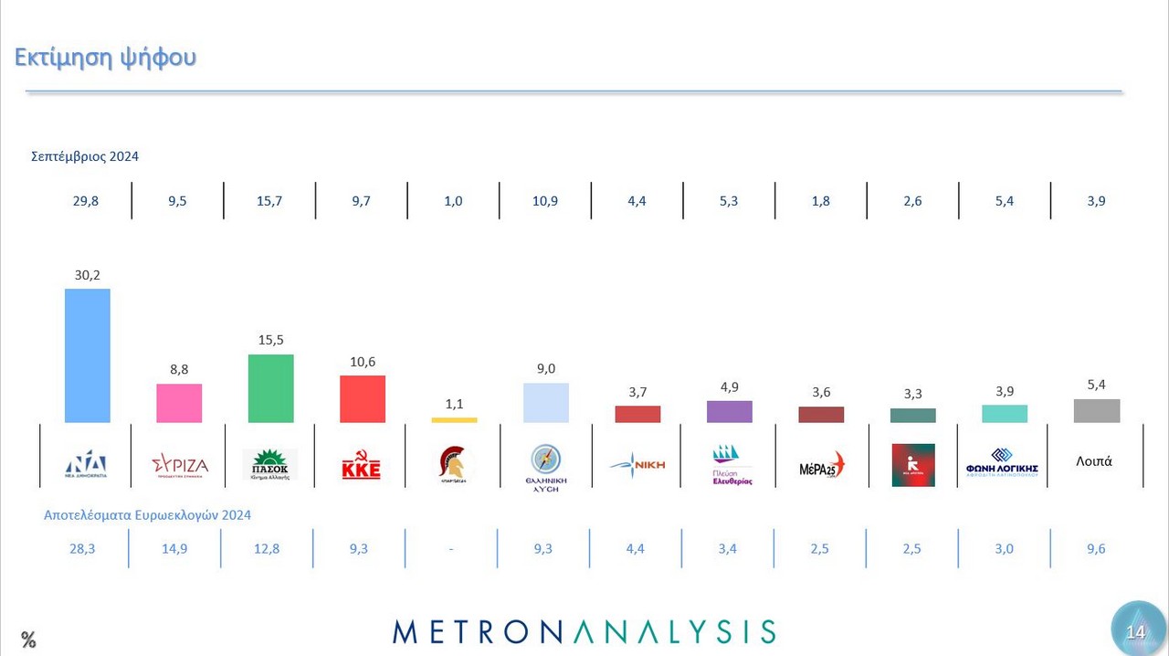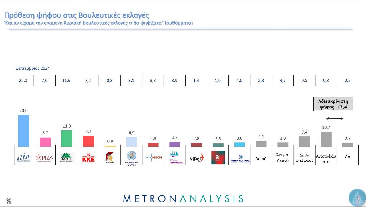 Η δημοσκόπηση, που έγινε αυτή τη φορά για λογαριασμό του MEGA, από την εταιρεία Metron Analysis, όσον αφορά την πρόθεση ψήφου, δείχνει τη ΝΔ να προηγείται με 23%, ακολουθούν το ΠΑΣΟΚ με 11,8%, το ΚΚΕ με 8,1%, η Ελληνική Λύση με 6,9%, ο ΣΥΡΙΖΑ πέμπτο κόμμα με 6,7%, η Πλεύση Ελευθερίας με 3,7% και η Φωνή Λογικής με 3%. Αδιευκρίνιστη ψήφος για το 13,4%.
