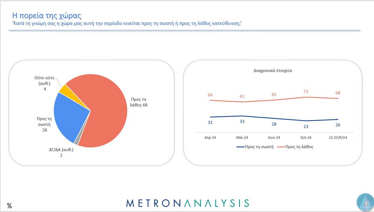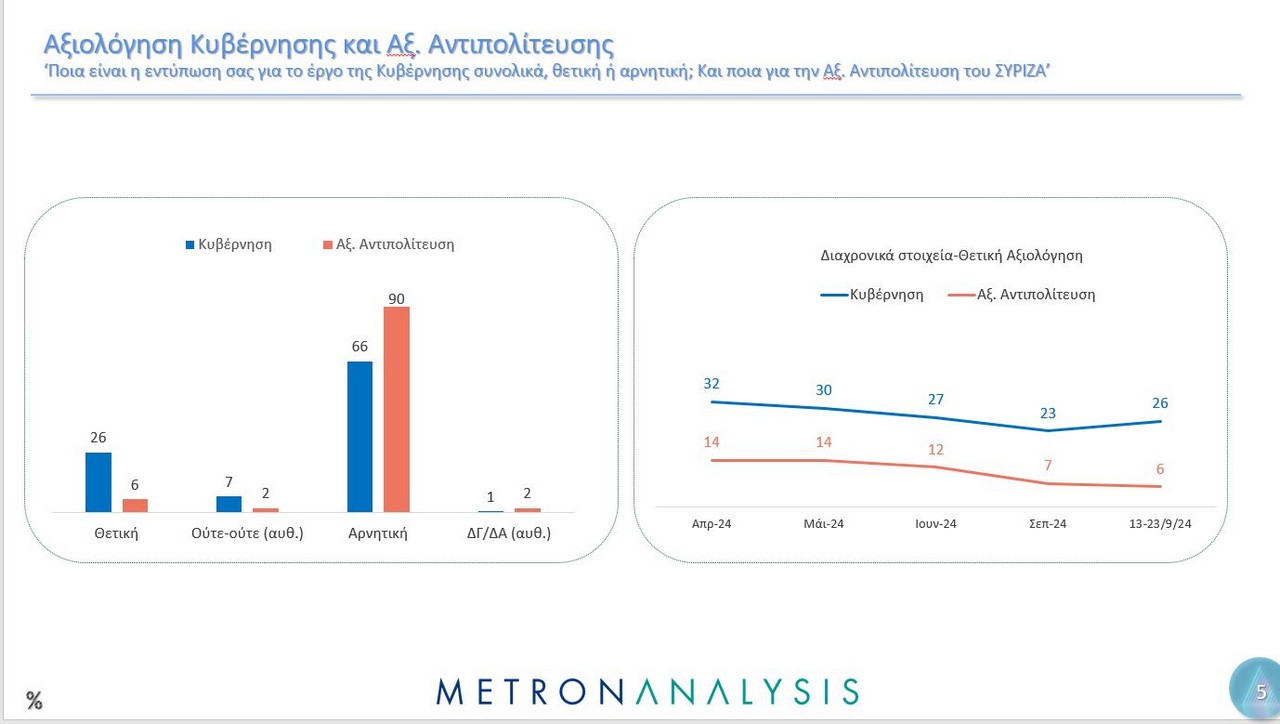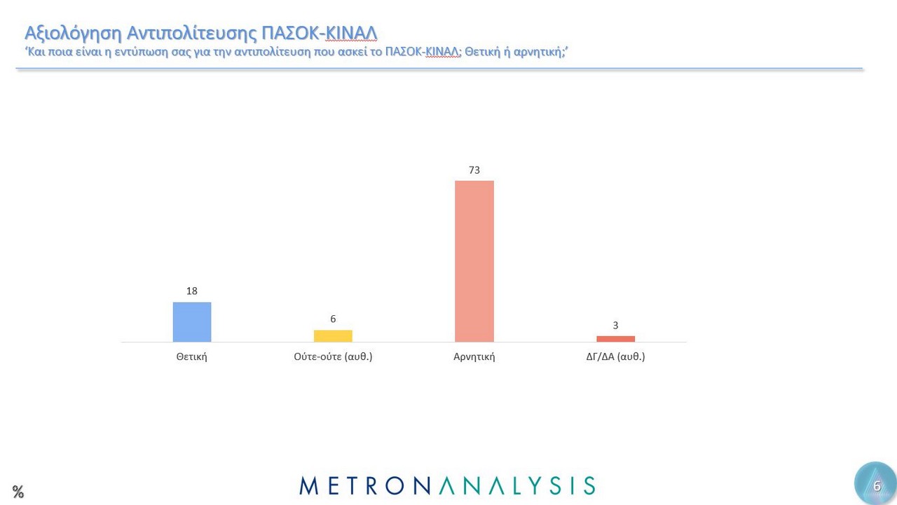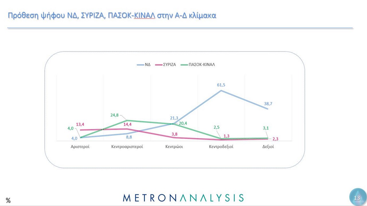 Η δημοσκόπηση, που έγινε αυτή τη φορά για λογαριασμό του MEGA, από την εταιρεία Metron Analysis, όσον αφορά την πρόθεση ψήφου, δείχνει τη ΝΔ να προηγείται με 23%, ακολουθούν το ΠΑΣΟΚ με 11,8%, το ΚΚΕ με 8,1%, η Ελληνική Λύση με 6,9%, ο ΣΥΡΙΖΑ πέμπτο κόμμα με 6,7%, η Πλεύση Ελευθερίας με 3,7% και η Φωνή Λογικής με 3%. Αδιευκρίνιστη ψήφος για το 13,4%.
