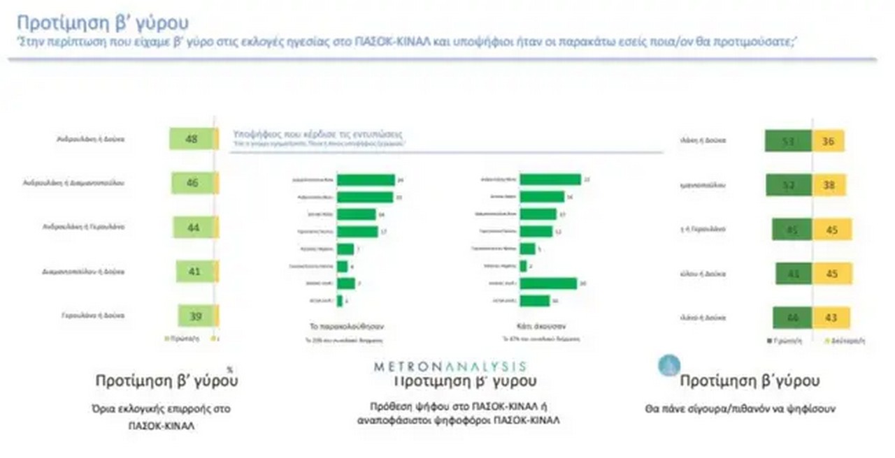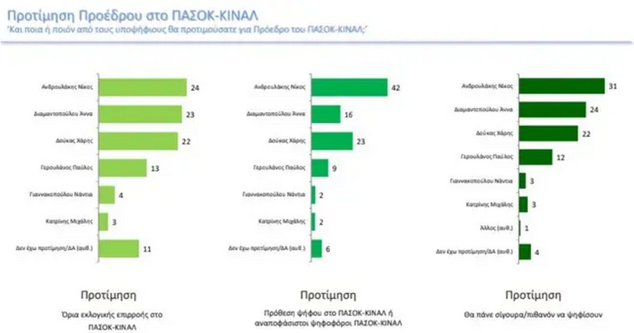 Σε όσους δηλώνουν πρόθεση ψήφου στο ΠΑΣΟΚ ή είναι αναποφάσιστοι ψηφοφόροι του ΠΑΣΟΚ, ο Νίκος Ανδρουλάκης προηγείται με 42%, ο Χάρης Δούκας ακολουθεί με 23%, η Άννα Διαμαντοπούλου με 15%, ο Παύλος Γερουλάνος με 9%.