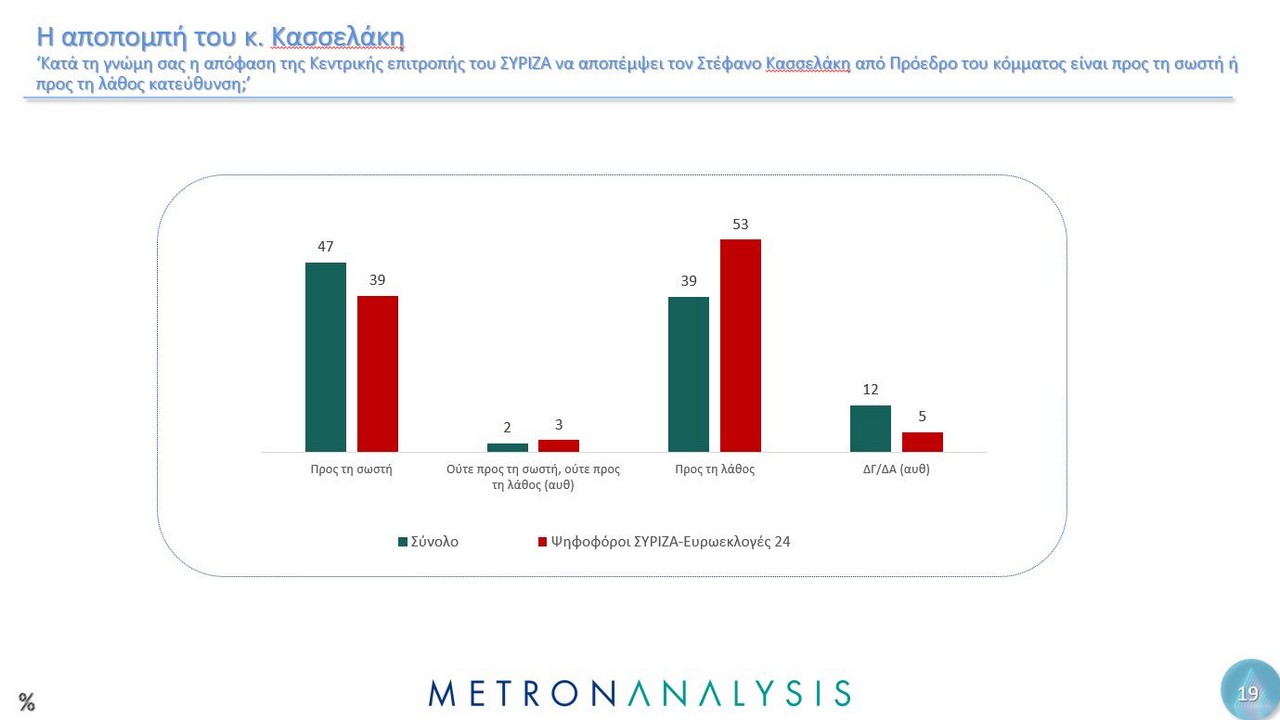 Η απόφαση για αποπομπή Κασσελάκη, οι ψηφοφόροι του ΣΥΡΙΖΑ σε ποσοστό 53% λένε ότι ήταν σε λάθος κατεύθυνση και το 39% προς την σωστή.