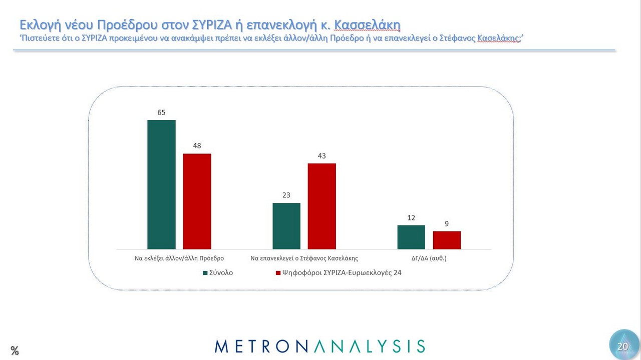 Το 43% των ψηφοφόρων ΣΥΡΙΖΑ λένε ότι πρέπει να επανεκλεγεί ο κ. Κασσελάκης ενώ το 48% θέλει εκλογή νέου προέδρου.