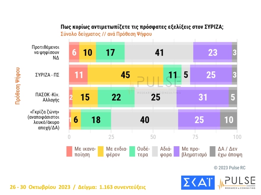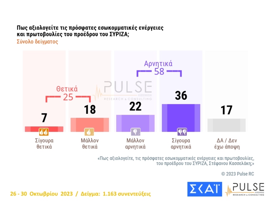 Αναφορικά με τις πρόσφατες εξελίξεις στον ΣΥΡΙΖΑ με την εκλογή του Στέφανου Κασσελάκη στην προεδρία του κόμματος και όλα όσα αυτή έφερε εντός του κόμματος, η δημοσκόπηση δείχνει πως η κοινή γνώμη δεν διατίθεται θετικά.
