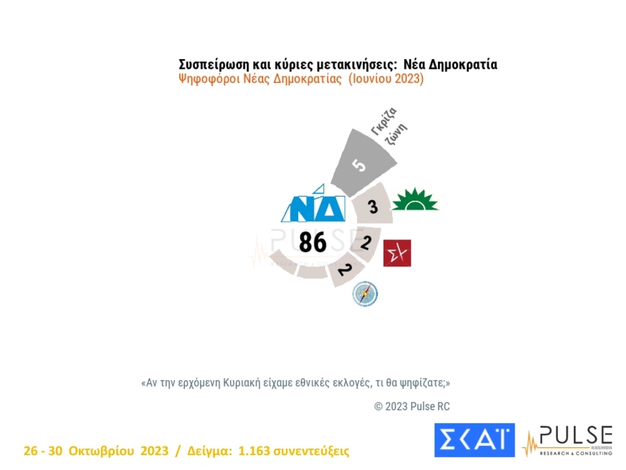 Νέα δημοσκόπηση της Pulse δημοσίευσε ο ΣΚΑΪ στο κεντρικό δελτίο ειδήσεων στην οποία φαίνεται ότι στην πρόθεση ψήφου των συμμετεχόντων, η Νέα Δημοκρατία προηγείται με 33.5%, ενώ δεύτερο κόμμα είναι ο ΣΥΡΙΖΑ που συγκεντρώνει το 15% των ψήφων.