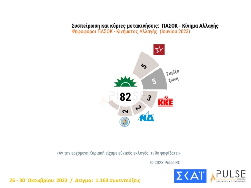 Τρίτο έρχεται ο ΠΑΣΟΚ, το οποίο συγκεντρώνει 12%, αλλά πλησιάζει καθώς στην προηγούμενη δημοσκόπηση της εταιρείας η διαφορά ήταν στις 6,5 μονάδες και τώρα έχει πέσει στις 3.