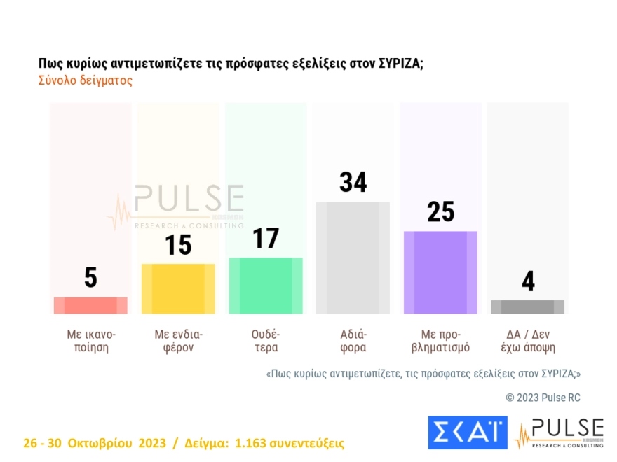 Συγκεκριμένα το 34% απαντά πως βλέπει τις εξελίξεις με «αδιαφορία», το 35% , με «προβληματισμό» και το 17% «ουδέτερα». Μόλις το 15% λέει ότι βλέπει τις τελευταίες εξελίξεις με «ενδιαφέρον» ενώ «με ικανοποίηση» απαντά το 5% των ερωτηθέντων.