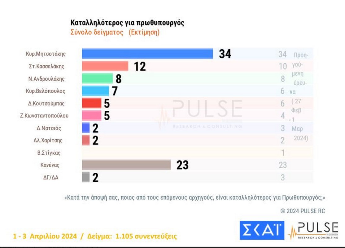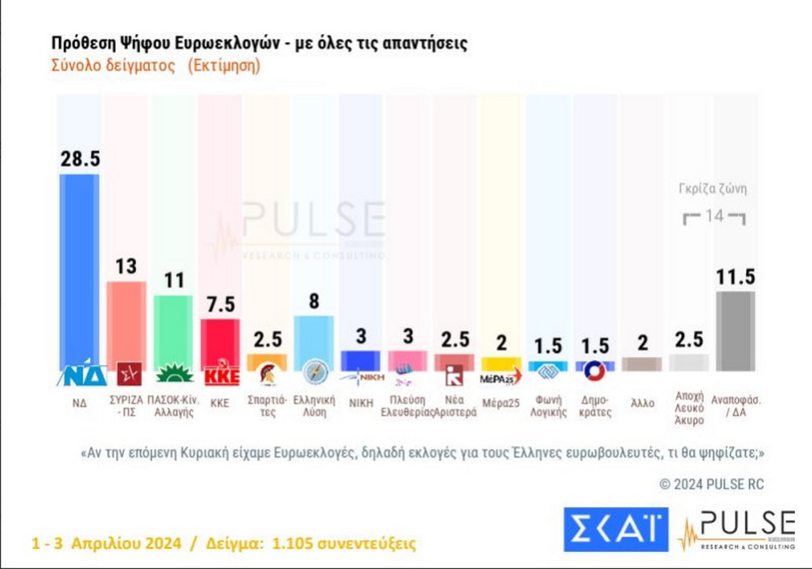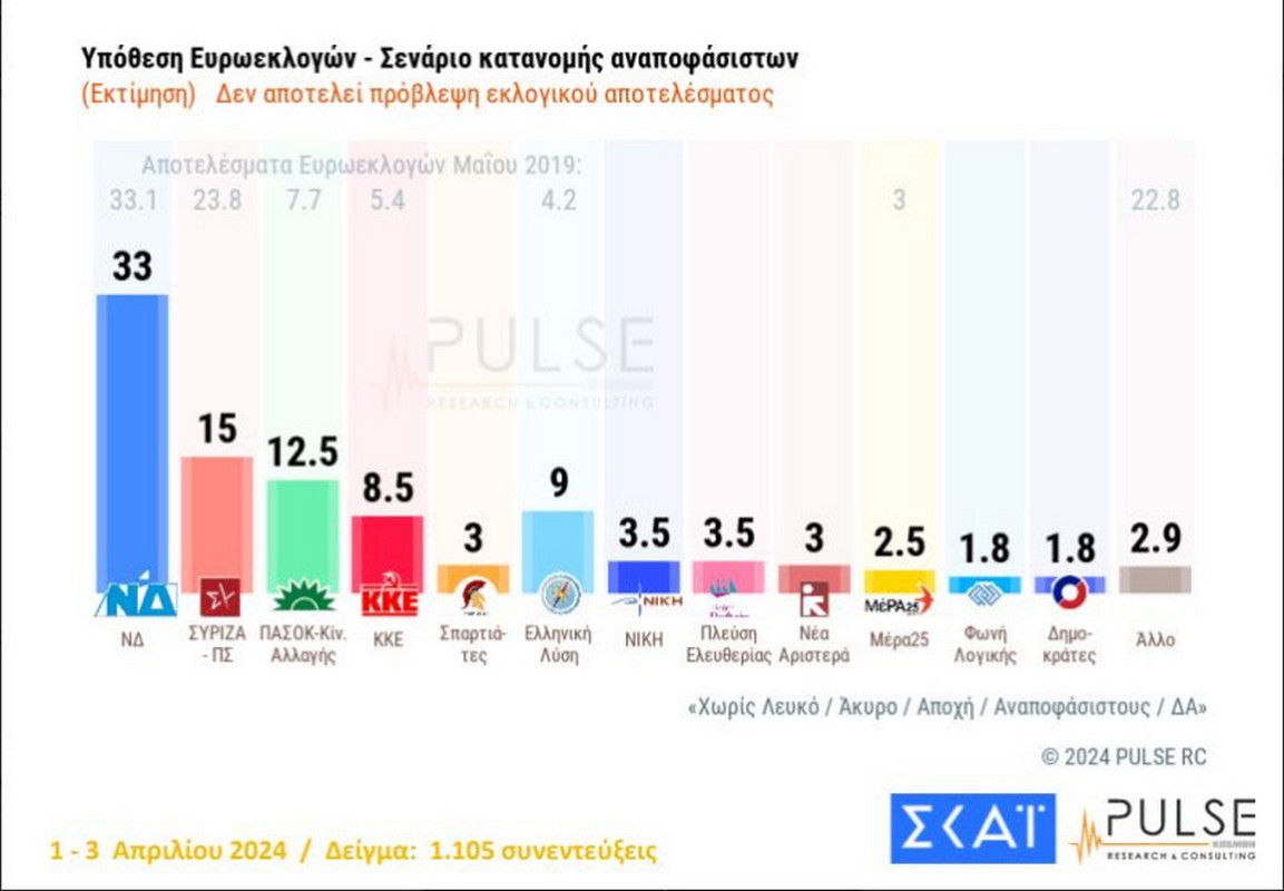 Σύμφωνα με τα αποτελέσματα της έρευνας που διεξήγαγε η Pulse στο διάστημα από 1 με 3 Απριλίου, η Νέα Δημοκρατία συγκεντρώνει 33%, ο ΣΥΡΙΖΑ 15%, το ΠΑΣΟΚ 12,5% και ακολουθούν η Ελληνική Λύση με 9%, το ΚΚΕ με 8,5%, η Νίκη και η Πλεύση Ελευθερίας με 3,5% και οι Σπαρτιάτες και η Νέα Αριστερά με 3%. Οι Δημοκράτες του Ανδρέα Λοβέρδου μετρήθηκαν στο 1,8%.