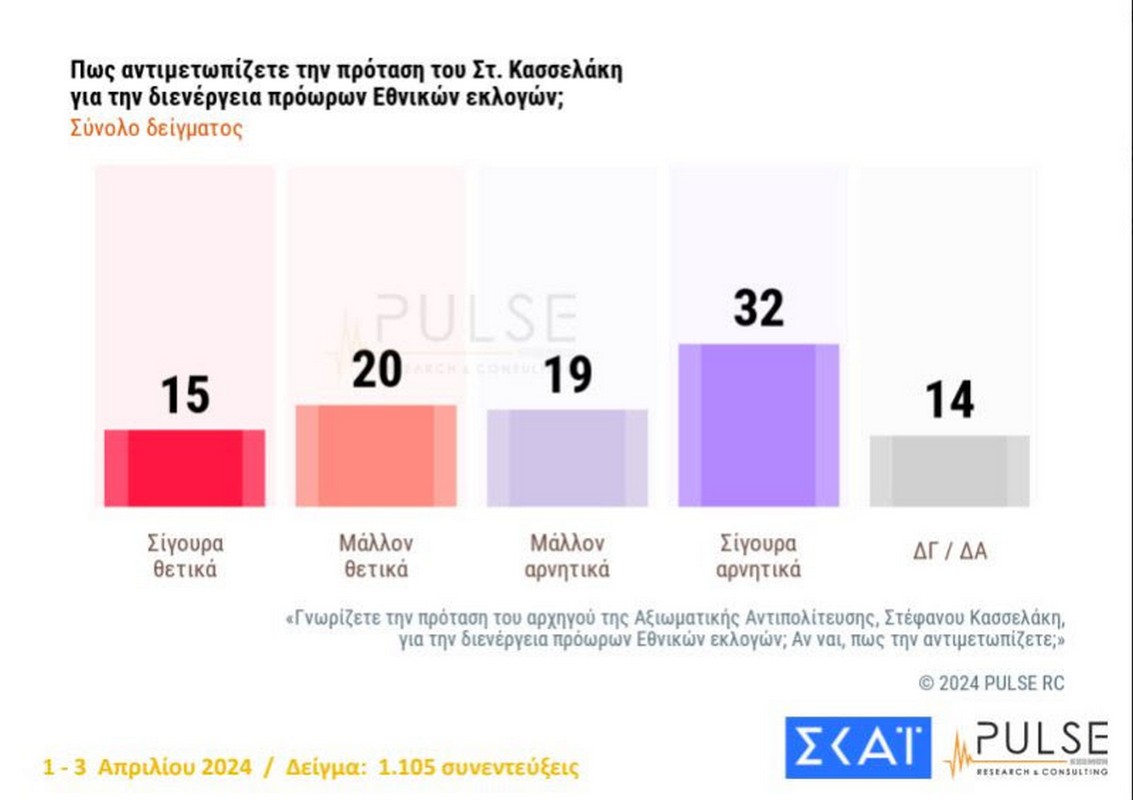 Παράλληλα σύμφωνα με την έρευνα της Pulse, αρνητική φαίνεται να εμφανίζεται η πλειοψηφία των πολιτών στο ενδεχόμενο πρόωρων βουλευτικών εκλογών.