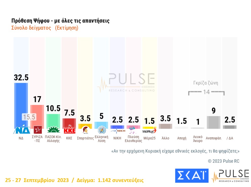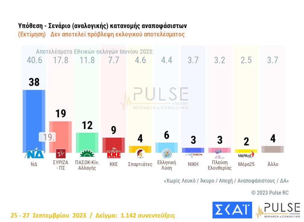 Στην πρόθεση ψήφου ο ΣΥΡΙΖΑ λαμβάνει 17% έναντι 32,5% της ΝΔ (διαφορά 15,5 ποσοστιαίες μονάδες), ενώ στο σενάριο της αναλογικής κατανομής των αναποφάσιστων η ΝΔ λαμβάνει 38% έναντι 19% του ΣΥΡΙΖΑ.Σε αυτό το σενάριο η διαφορά ανάμεσα στα δύο κόμματα φτάνει τις 19 ποσοστιαίες μονάδες.