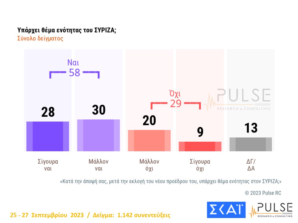 Ζήτημα ενότητας στον ΣΥΡΙΖΑ «βλέπουν» μετά την εκλογή Κασσελάκη στην ηγεσία του κόμματος, περί τους 6 στους 10 πολίτες (58%), σύμφωνα με τη δημοσκόπηση της Pulse για τον Σκάι, που παρουσιάστηκε στο κεντρικό δελτίο ειδήσεων.