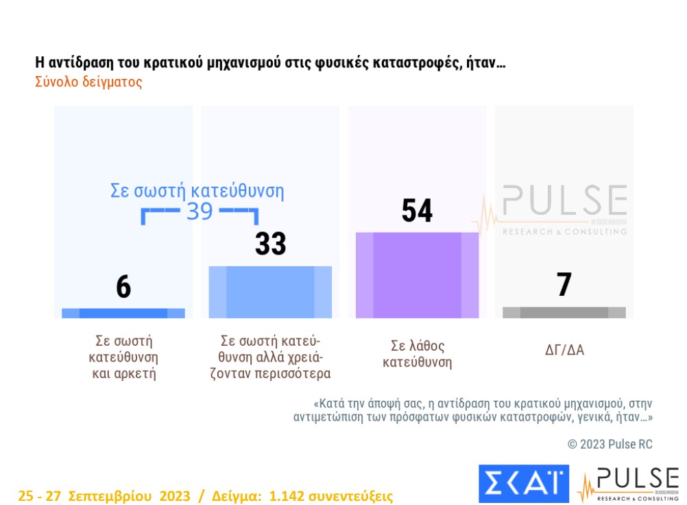 Σύμφωνα με τη δημοσκόπηση της Pulse που παρουσιάστηκε σε κεντρικό δελτίο ειδήσεων του ΣΚΑΙ, το 54% θεωρεί ότι η αντίδραση του κρατικού μηχανισμού στις καταστροφές ήταν σε λάθος κατεύθυνση