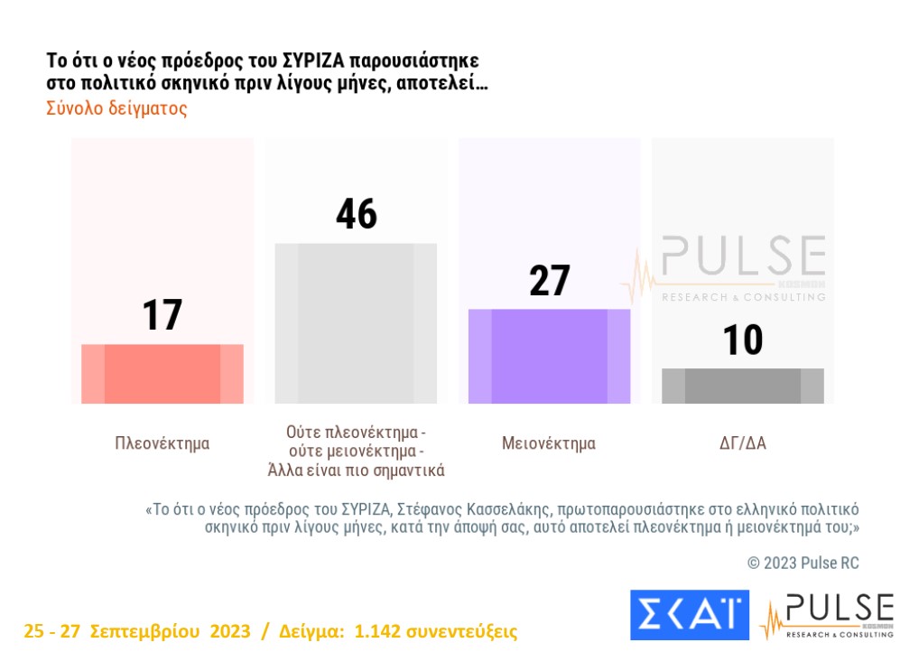 Στο ερώτημα «το ότι ο νέος πρόεδρος του ΣΥΡΙΖΑ Στέφανος Κασσελάκης, πρωτοπαρουσιάστηκε στο ελληνικό πολιτικό σκηνικό πριν λίγους μήνες, κατά την άποψή σας, αυτό αποτελεί πλεονέκτημα ή μειονέκτημά του;»: