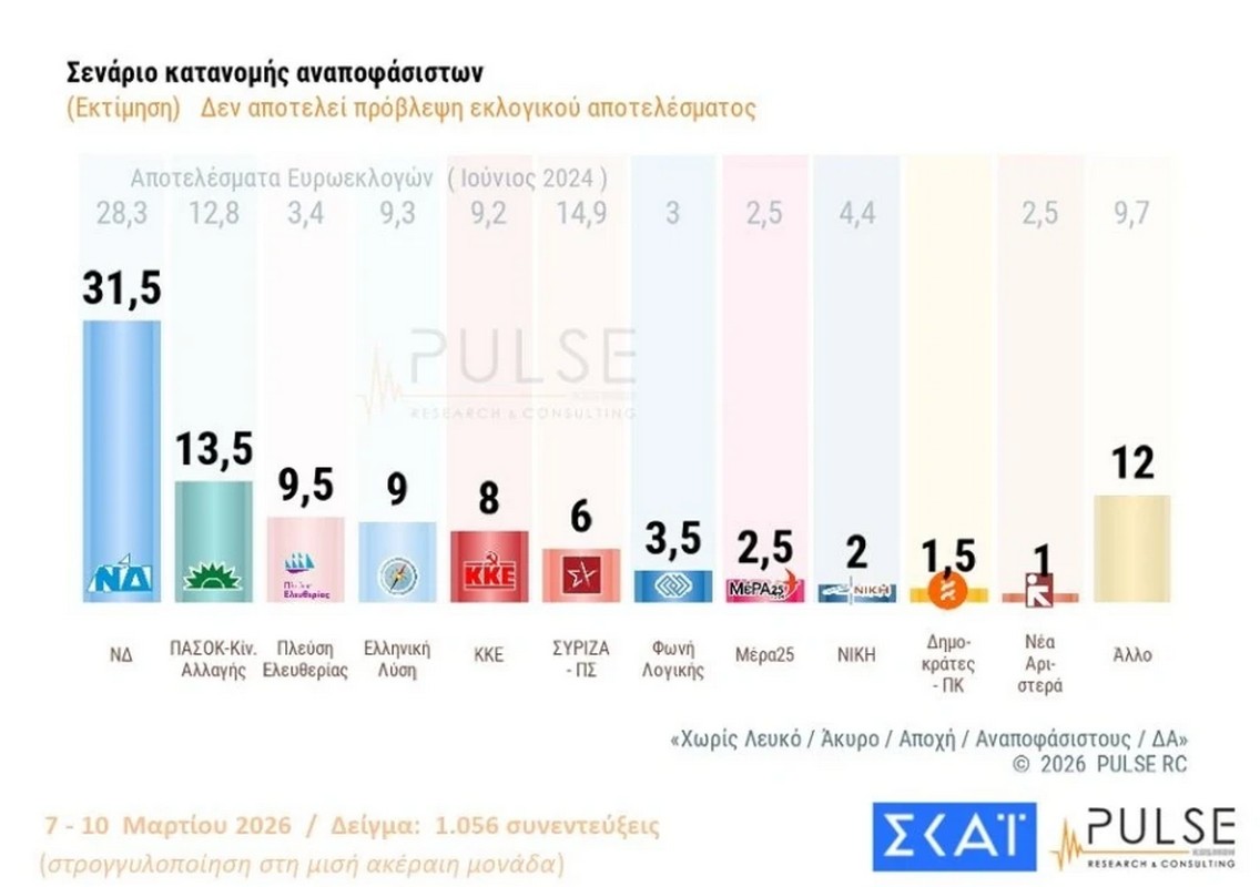 Ενδιαφέρον παρουσιάζει ωστόσο το σενάριο κατανομής των αναποφάσιστων, καθώς εκεί συντριπτικά η Νέα Δημοκρατία κερδίζει με 31,5%, με το ΠΑΣΟΚ να είναι δεύτερο με 13,5%.