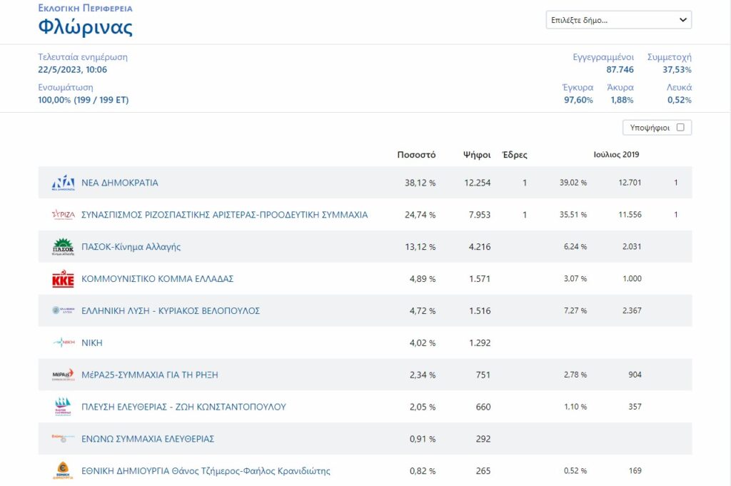 Στη Φλώρινα, με την καταμέτρηση να έχει ολοκληρωθεί στο 100% των εκλογικών τμημάτων, η Νέα Δημοκρατία καταλαμβάνει μία έδρα και μία ο ΣΥΡΙΖΑ.