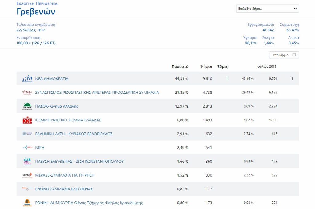 Στη μονοεδρική εκλογική περιφέρεια των Γρεβενών, την έδρα παίρνει και αυτή τη φορά η ΝΔ με πρώτο σε σταυρούς τον Γιάννη Γιάτσιο με 3.521 ψήφους, στην ενσωμάτωση των σταυρών από τα 108 εκλογικά τμήματα (σε σύνολο 126 τμημάτων).