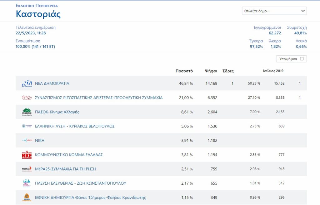Μονοεδρική η Καστοριά, που το 2019 είχε δύο βουλευτές. Στο 100% των ψήφων, πρώτη έρχεται η Μαρία Αντωνίου.