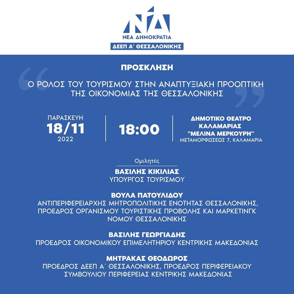 Την Παρασκευή 18/11 στις 18:00 στο δημοτικό Θέατρο Καλαμαριάς «Μελίνα Μερκούρη» η ΔΕΕΠ Α’ Θεσσαλονίκης της Νέας Δημοκρατίας διοργανώνει πολιτική εκδήλωση με θέμα «Ο ρόλος του Τουρισμού στην αναπτυξιακή προοπτική της Οικονομίας της Θεσσαλονίκης».