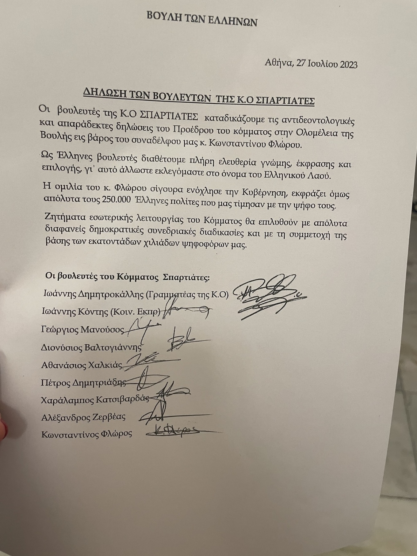 Οι βουλευτές της ΚΟ ΣΠΑΡΤΙΑΤΕΣ καταδικάζουμε τις αντιδεοντολογικές και απαράδεκτες δηλώσεις του προέδρου του κόμματος στην Ολομέλεια της βουλής εις βάρους του συναδέλφου μας κ. Κωνσταντίνου Φλώρου.