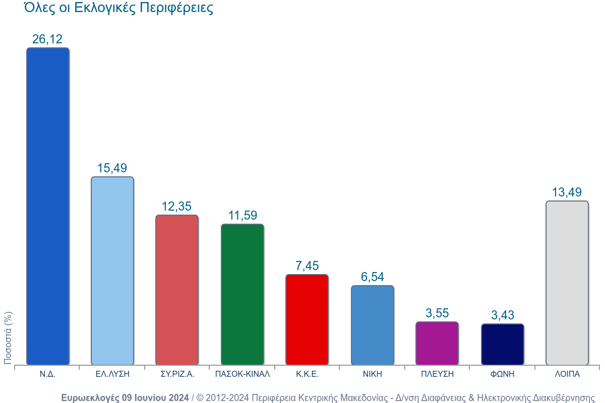 Στο 100% λοιπόν ή αλλιώς σε 2.829 από 2.829 εκλογικά τμήματα, η ΝΔ έρχεται πρώτη με 26,12%, δεύτερη η Ελληνική Λύση με 15,49% και ακολουθούν ΣΥΡΙΖΑ με 12,35%, ΠΑΣΟΚ με 11,59%, ΚΚΕ με 7,45%, Νίκη με 6,54%, Πλεύση Ελευθερίας με 3,55% και Φωνή Λογικής με 3,43%.