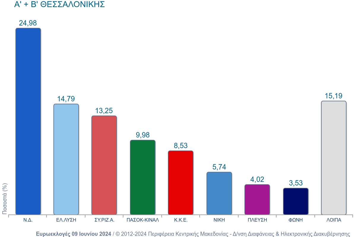 Στο 100%, η ΝΔ είναι πρώτη με 24,98%, δεύτερη η Ελληνική Λύση με 14,79% και ακολουθούν ΣΥΡΙΖΑ με 13,25%, ΠΑΣΟΚ με 9,98%, ΚΚΕ με 7,45%, Νίκη με 5,74%, Πλεύση Ελευθερίας με 4,02% και Φωνή Λογικής με 3,53%.