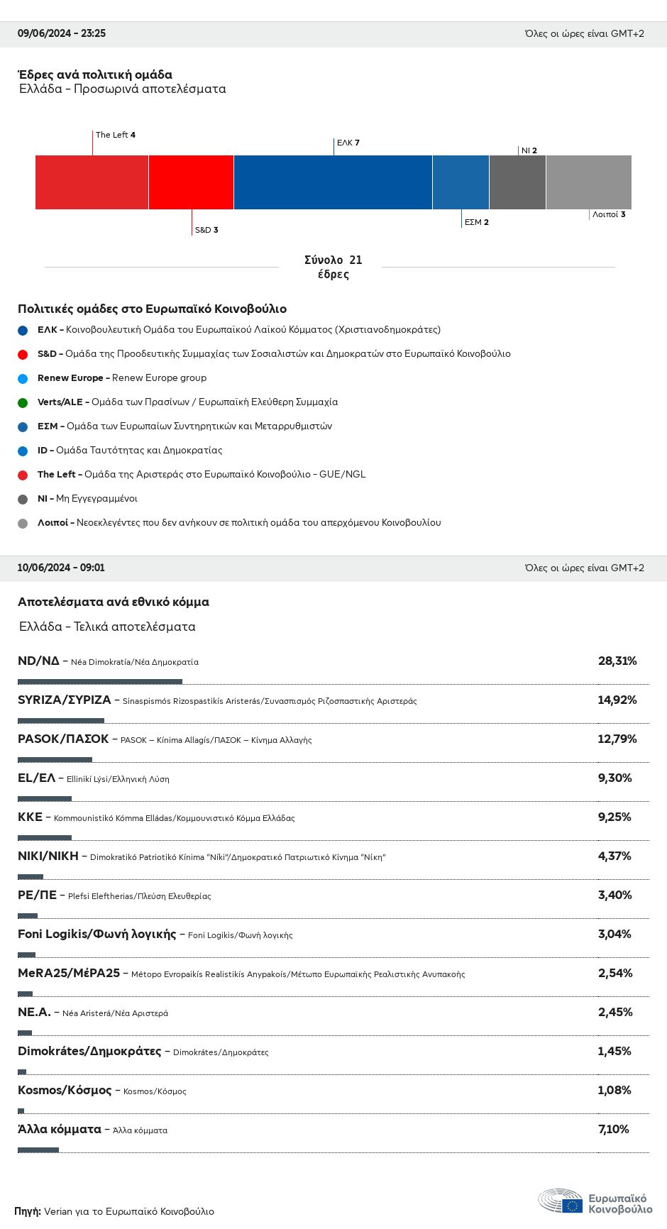 Τέλος, οι ευρωβουλευτές της Νίκης (Νίκος Αναδιώτης), της Πλεύσης Ελευθερίας (Μαρία Ζαχαριά) και της Φωνής Λογικής (Αφροδίτη Λατινοπούλου) βρίσκονται στους Νεοεκλεγέντες και ακόμη δεν ανήκουν σε κάποια πολιτική ομάδα.