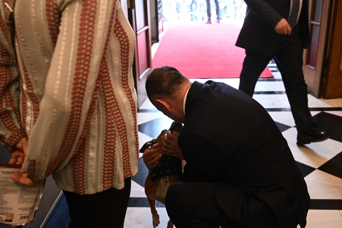 Ο πρωθυπουργός τον υποδέχθηκε κατεβαίνοντας τα σκαλιά και μέρος της εθιμοτυπίας ήταν και ο σκύλος Πίνατ. Η συνάντηση είχε προγραμματιστεί να διαρκέσει 45 λεπτά αλλά η ώρα περνούσε και οι δυο τους δεν έβγαιναν για τις κοινές δηλώσεις.
