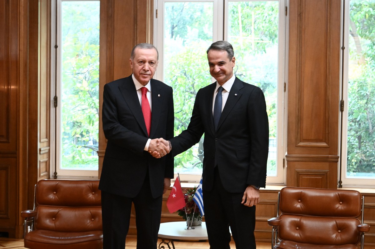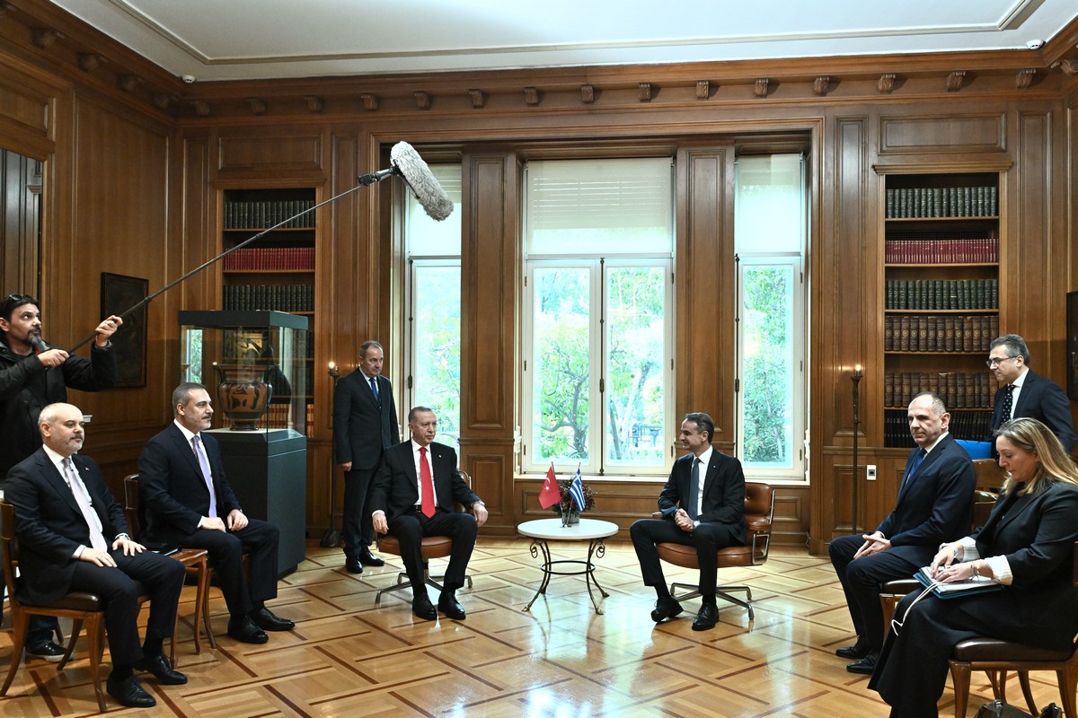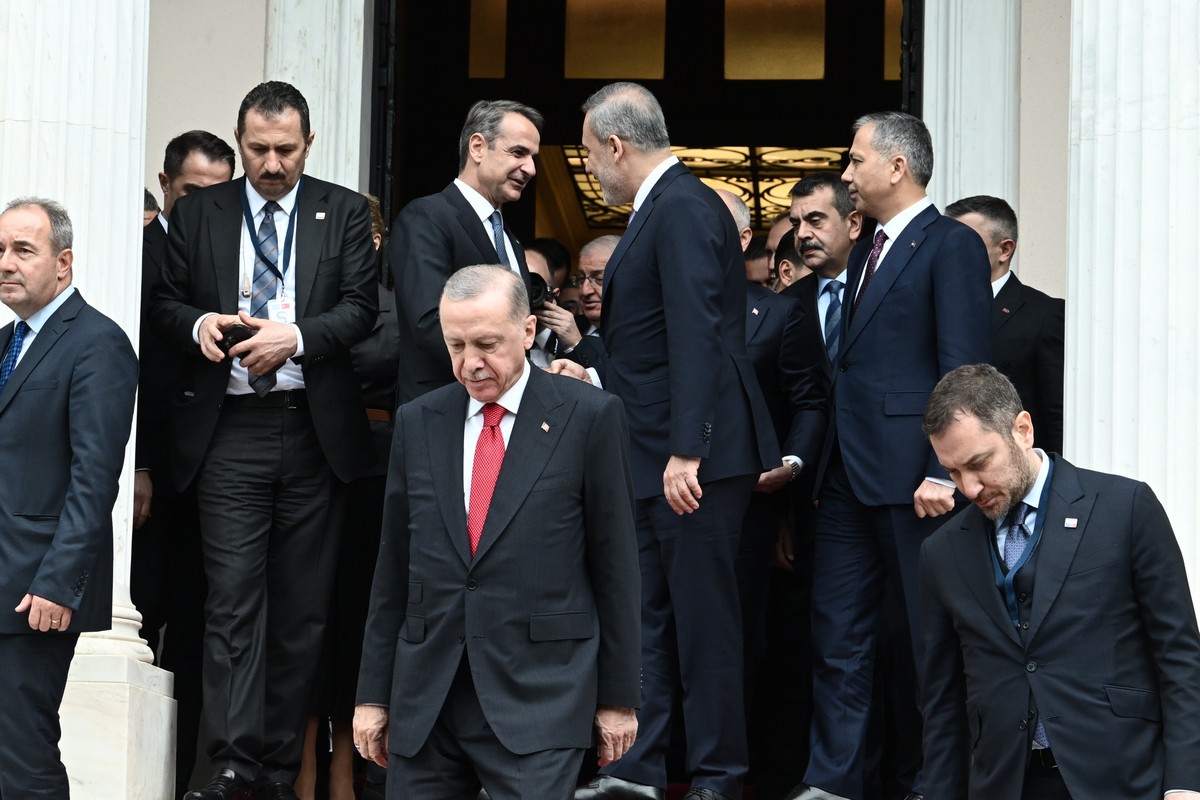 Ο Τούρκος πρόεδρος έφτασε στο Μέγαρο Μαξίμου νωρίτερα από τις 12.15 που ήταν το προγραμματισμένο ραντεβού με τον Κυριάκο Μητσοτάκη.