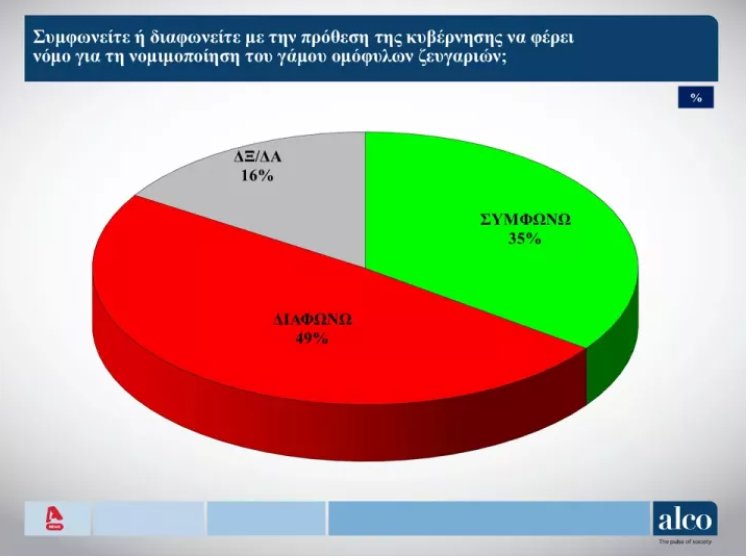 Όσον αφορά το γάμο των ομόφυλων ζευγαριών το 49% δηλώνει ότι διαφωνεί έναντι 35% που αναφέρει ότι συμφωνεί και 16% που δηλώνει ότι δεν ξέρει ή δεν απαντά.
