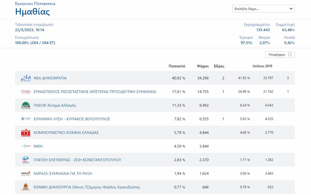 Στο 100% των εκλογικών τμημάτων, η ΝΔ στην Ημαθία εκλέγει δυο βουλευτές και από έναν ο ΣΥΡΙΖΑ και η Ελληνική Λύση.