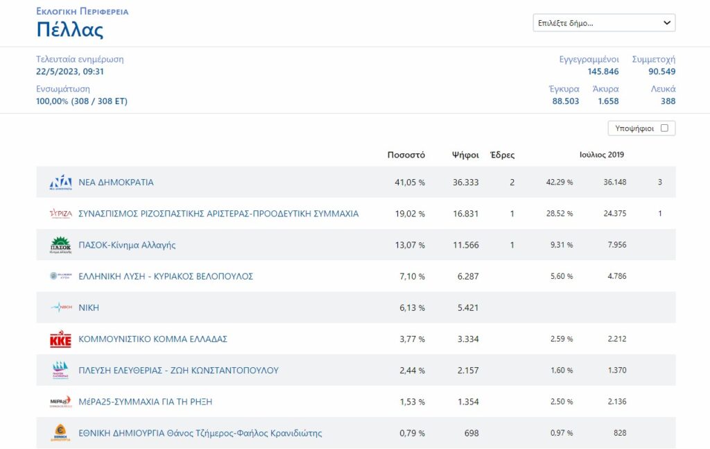 Στην Πέλλα, στο 100% των εκλογικών τμημάτων, η ΝΔ βγάζει δύο βουλευτές και από έναν ο ΣΥΡΙΖΑ και το ΠΑΣΟΚ.