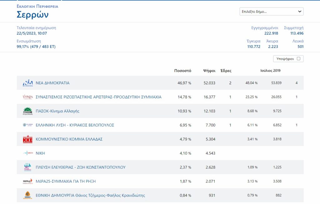 Δύο βουλευτές εκλέγει η ΝΔ στον νομό Σερρών και από έναν ο ΣΥΡΙΖΑ το ΠΑΣΟΚ και η Ελληνική Λύση, σύμφωνα με τα όσα προκύπτουν από την καταμέτρηση σε 479 από τα 483 εκλογικά τμήματα.