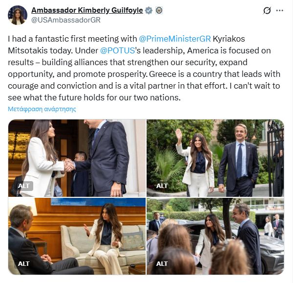 «Υπό την ηγεσία του Ντόναλντ Τραμπ, η Αμερική επικεντρώνεται στα αποτελέσματα, στη δημιουργία συμμαχιών που ενισχύουν την ασφάλειά μας, διευρύνουν τις ευκαιρίες και προωθούν την ευημερία. Η Ελλάδα είναι μια χώρα που ηγείται με θάρρος και πεποίθηση και αποτελεί ζωτικό εταίρο σε αυτήν την προσπάθεια. Ανυπομονώ να δω τι επιφυλάσσει το μέλλον για τις δύο χώρες μας», πρόσθεσε.