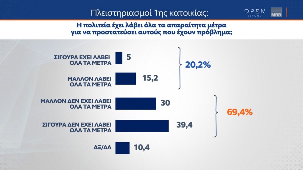 Η κατάσταση δυσκολεύει ακόμη περισσότερο για την κυβέρνηση από το γεγονός ότι το 69,4% πιστεύει ότι η πολιτεία δεν έχει λάβει όλα τα απαραίτητα μέτρα, ενώ η ίδια αίσθηση υπάρχει και στους ψηφοφόρους της ΝΔ του 2019 με ποσοστό 46,6% έναντι 44,5%.