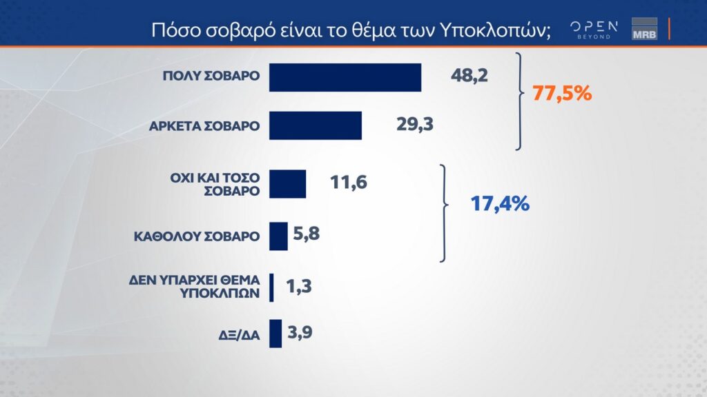 Παρά την συστηματική κυβερνητική προσπάθεια να υποβαθμίσει το σκάνδαλο των υποκλοπών, οι πολίτες φαίνεται να έχουν διαφορετική γνώμη. Σε ποσοστό 77,5% κρίνουν πολύ και αρκετά σοβαρό το ζήτημα. Κόλαφος για τον Κ. Μητσοτάκη είναι το 69,8% των ψηφοφόρων της ΝΔ που κρίνουν πολύ και αρκετά σοβαρό το ζήτημα.