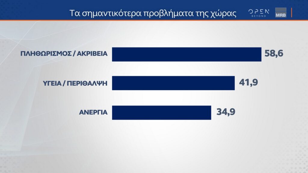 Σε ποσοστό άνω του 61% οι πολίτες δηλώνουν απαισιοδοξία για την κατάσταση της χώρας σήμερα, με την ακρίβεια να αποτελεί μακράν το σημαντικότερο πρόβλημα που αντιμετωπίζει η κοινωνία με ποσοστό 58,6%, ενώ στη δεύτερη θέση έρχονται τα ζητήματα υγείας και περίθαλψης με ποσοστό 41,9%, λίγες μόλις μέρες μετά το νομοσχέδιο ιδιωτικοποίησης του ΕΣΥ. Ίδια είναι η εικόνα και στο ερώτημα για το ποιο θέμα θα καθορίσει την ψήφο στις εκλογές, όπου πρώτη με 68,8% έρχεται η αντιμετώπιση της ακρίβειας και δεύτερη με 42,3% η ενίσχυση του ΕΣΥ. Το δεύτερο έχει ξεχωριστή σημασία μετά και την ψήφιση από την κυβέρνηση του νομοσχεδίου για την δευτεροβάθμια περίθαλψη, που ανοίγει το δρόμο στην ιδιωτικοποίηση του ΕΣΥ και αποτέλεσε σημείο σφοδρής πολιτικής αντιπαράθεσης το προηγούμενο διάστημα.