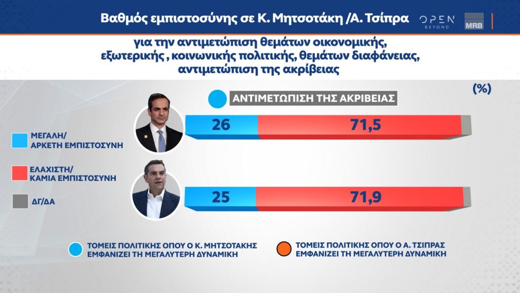 Η υπεροχή του Αλ. Τσίπρα έναντι του Κ. Μητσοτάκη στα ζητήματα της καθημερινότητας των νοικοκυριών, της χρηστής διαχείρισης αλλά και της εμπιστοσύνης σε ζητήματα διαφάνειας και ακεραιότητας αποτυπώνεται στο ερώτημα «Σε ποιον θα εμπιστευόσασταν τα κλειδιά του σπιτιού σας;». Εκεί ο Αλ. Τσίπρας υπερέχει του Κ. Μητσοτάκη με 26,5% έναντι 24,2%.