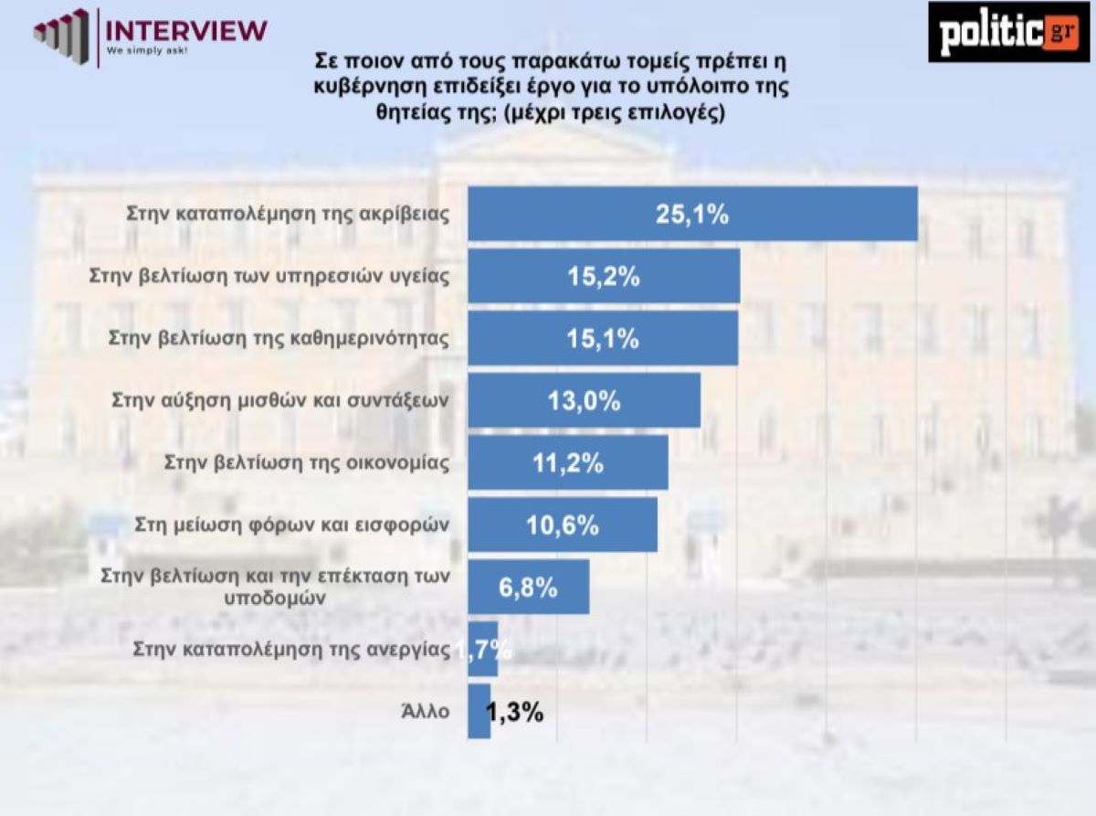 Το 25,1% των ερωτηθέντων τοποθετεί πρώτο το πρόβλημα της ακρίβειας. Παρά το γεγονός ότι το κόστος ζωής παραμένει σταθερά το κορυφαίο πρόβλημα για την κοινωνία – όπως καταγράφεται διαρκώς σε όλες τις δημοσκοπήσεις – η κυβερνητική ανταπόκριση εξακολουθεί να θεωρείται ανεπαρκής.