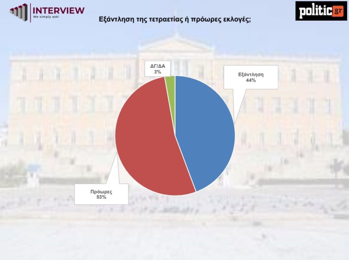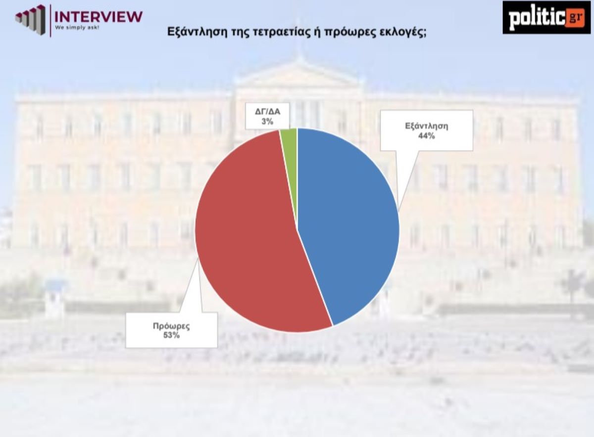 Παράλληλα, καταγράφεται πλειοψηφικό αίτημα για πρόωρες εκλογές. Το 53% των ερωτηθέντων επιθυμεί προσφυγή στις κάλπες πριν την ολοκλήρωση της κυβερνητικής θητείας. Το 44% δηλώνει ότι προτιμά την εξάντληση της τετραετίας, ενώ 3% δεν τοποθετείται.