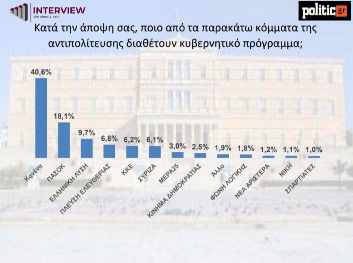 Ενδιαφέρον πολιτικό εύρημα αποτελεί το 40,6% σύμφωνα με το οποίο «κανένα κόμμα» της αντιπολίτευσης δεν έχει κυβερνητικό πρόγραμμα. Δηλαδή, τα κόμματα έχουν αφήγημα αντιπολίτευσης, αλλά όχι εναλλακτικής διακυβέρνησης.