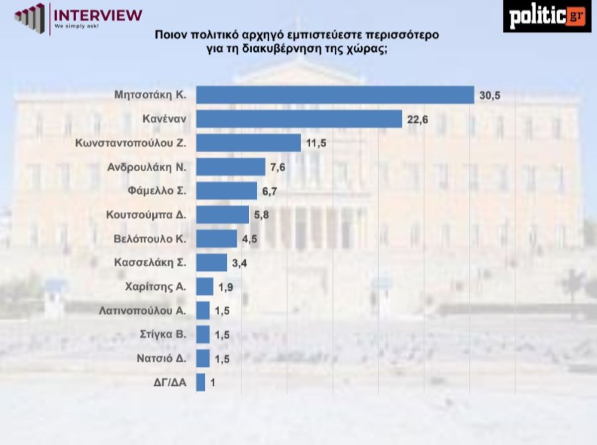 Αν και η κυβέρνηση της ΝΔ καταγράφει φθορά, ο Κυριάκος Μητσοτάκης εξακολουθεί να προηγείται στην ερώτηση για τον πολιτικό αρχηγό που εμπνέει περισσότερη εμπιστοσύνη στη διακυβέρνηση της χώρας, συγκεντρώνοντας 30,5%. Στη δεύτερη θέση είναι ο «Κανένας» με 22,6%.