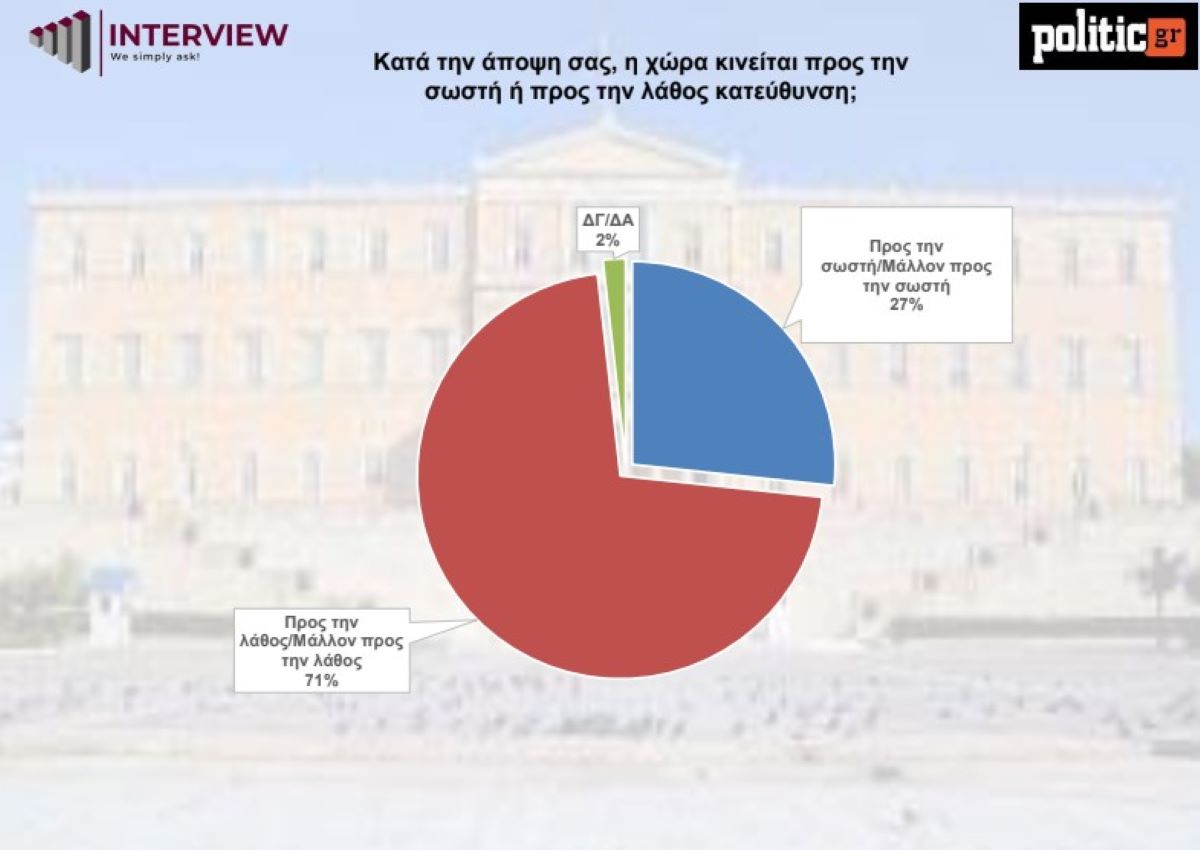 Το 71% των ερωτηθέντων εκτιμά πως η χώρα κινείται «προς τη λάθος» κατεύθυνση. Μόλις το 27% εκτιμά ότι η κατεύθυνση είναι σωστή.