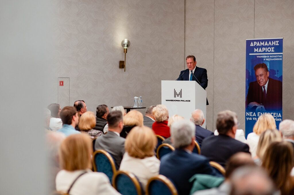 Σε μια κατάμεστη αίθουσα του «Μακεδονία Παλλάς» και εν μέσω ενός ενθουσιώδους κοινού, ο υποψήφιος βουλευτής της Α’ Θεσσαλονίκης Μάριος Δράμαλης έστειλε μήνυμα ανανέωσης στην κεντρική πολιτική ομιλία του ενόψει των εκλογών της 21ης Μαϊου.