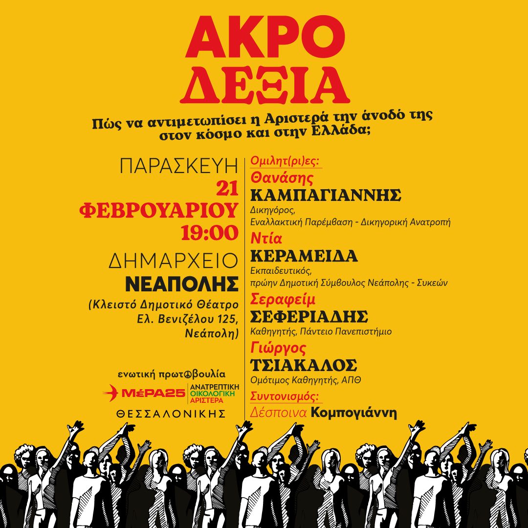Πρόκειται για πρωτοβουλία του ΜέΡΑ25, η οποία θα προσπαθήσει να δώσει απαντήσεις σε καίρια ερωτήματα της εποχής μας: Πώς αντιμετωπίζουμε σήμερα το γκρίζο κύμα της Ακροδεξιάς στον κόσμο, την Ευρώπη και την Ελλάδα; Ποιά είναι η απάντηση της ριζοσπαστικής Αριστεράς;