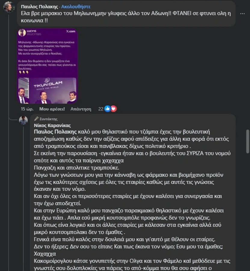 Ο βουλευτής του ΣΥΡΙΖΑ σχολίασε κάτω από την ανάρτηση, αποκαλώντας τον Νίκο Καρανίκα «παρακμιακό ωφελιμιστικό μειράκιο». Παράλληλα, τον κατηγόρησε ότι «γλείφει» τον υπουργό Υγείας, αφήνοντας υπαινιγμούς σχετικά με την επαγγελματική δραστηριότητά του στον χώρο της φαρμακευτικής κάνναβης.