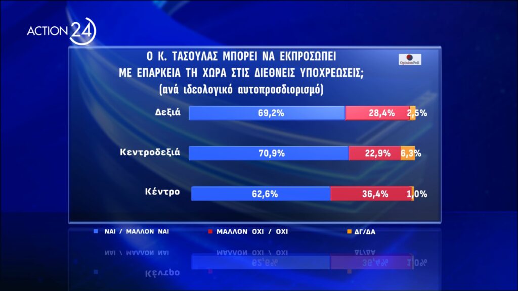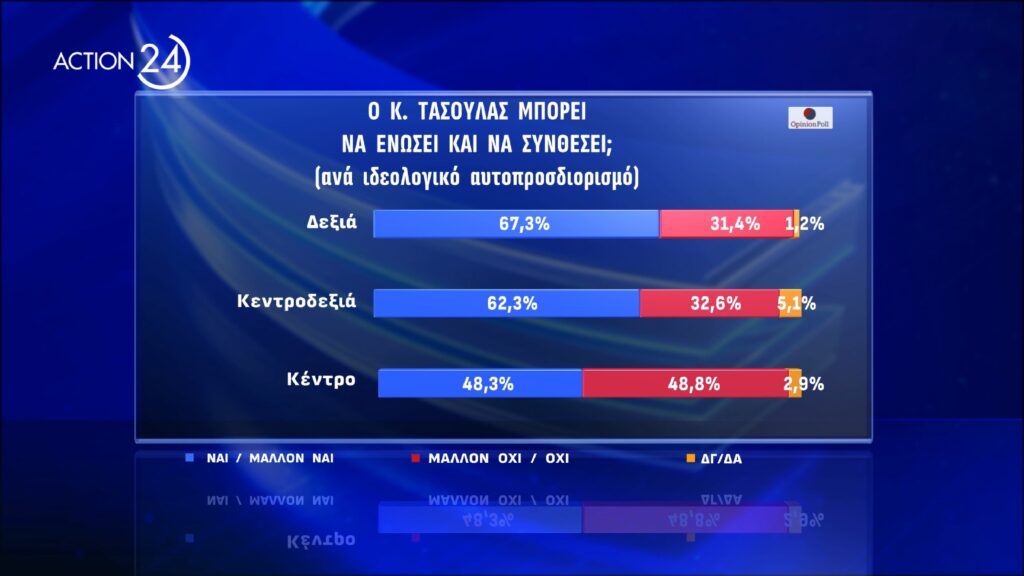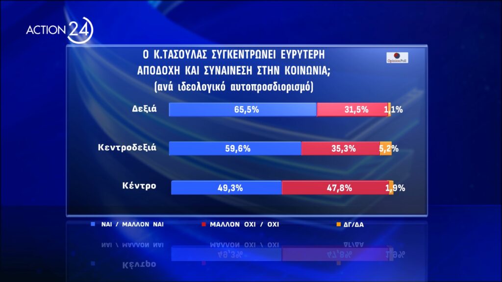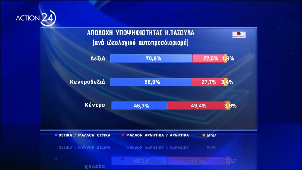 Β. Για τον Κ. Τασούλα οι θετικές απόψεις φτάνουν στο 70.6% στον χώρο της Δεξιάς, στο 68.9% στην Κεντροδεξιά, ενώ εμφανίζει αποδοχή της τάξης του 46.7% στον χώρο του Κέντρου.
