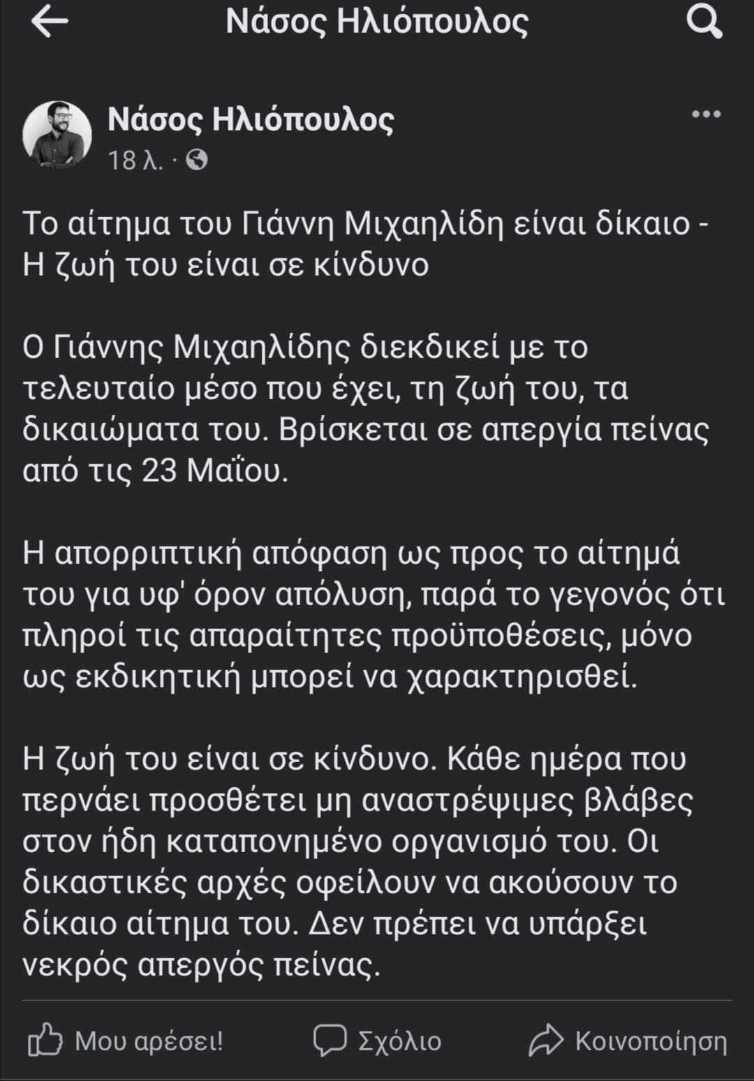 Ο Εκπρόσωπος τύπου του ΣΥΡΙΖΑ, Νάσος Ηλιόπουλος, με ανάρτηση του στα social media, αναφέρει πως το αίτημα του Γιάννη Μιχαηλίδη είναι δίκαιο και ότι η ζωή του είναι σε κίνδυνο.