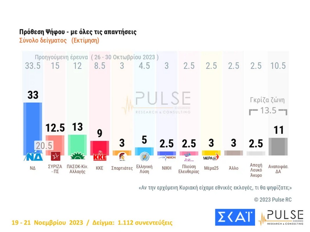 Για πρώτη φορά εμφανίζει η Pulse το ΠΑΣΟΚ δεύτερο και τον ΣΥΡΙΖΑ στην τρίτη θέση, στην δημοσκόπηση που παρουσιάστηκε, το βράδυ της Πέμπτης, στο κεντρικό δελτίο του ΣΚΑΙ.