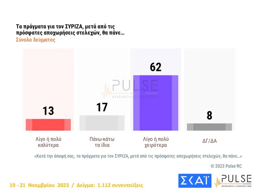 Η πιο αποκαλυπτική για τα τεκταινόμενα στον ΣΥΡΙΖΑ εικόνα είναι η σύγκριση των απαντήσεων που δίνουν οι ψηφοφόροι του κόμματος στις εκλογές του Ιουνίου, σε σύγκριση με όσους δηλώνουν ότι το ψηφίζουν σήμερα: Οι σημερινοί ψηφοφόροι του δηλώνουν σε ποσοστό 57% ότι τα πράγματα θα πάνε καλύτερα μετά από τις αποχωρήσεις των στελεχών της «Ομπρέλας», ενώ οι ψηφοφόροι του περασμένου Ιουνίου δηλώνουν το ίδιο σε ποσοστό μόλις 38%.